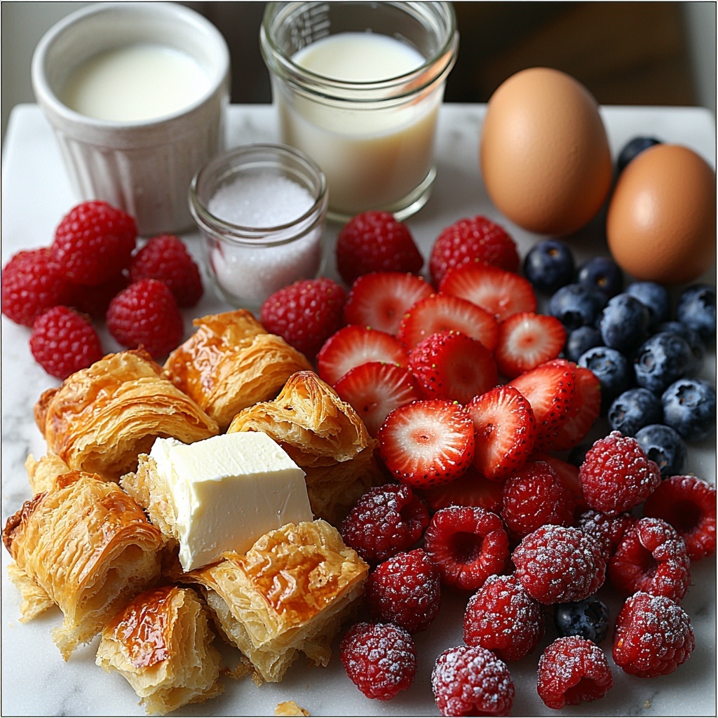 This Berry Croissant Bake Recipe uses straightforward ingredients that work beautifully together to create a symphony of taste and texture. Each component plays a special role—fresh berries bring natural sweetness and bright color, croissants add flakiness and richness, and the creamy custard ties everything into pure breakfast heaven.