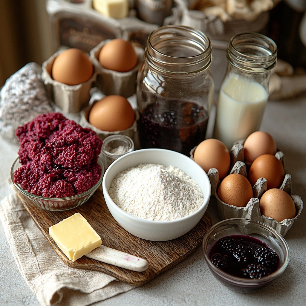These ingredients are straightforward yet brilliantly purposeful, each lending their unique magic to ensure your Blackberry Velvet Cake turns out delectable and beautifully textured. From the all-purpose flour providing structure to the vibrant blackberry puree adding color and flavor, every component plays an essential role.