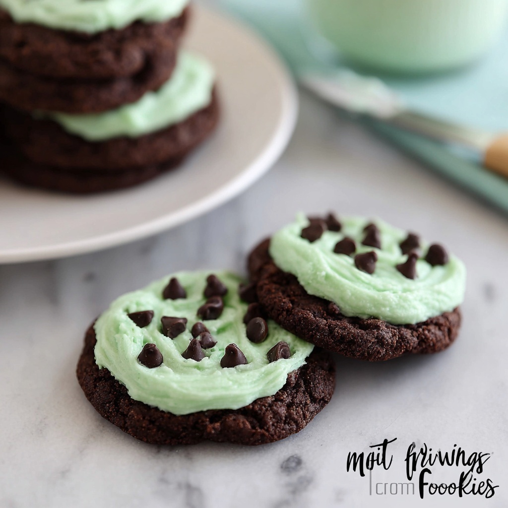In a mixing bowl, beat together powdered sugar and softened butter until fully combined and creamy. Gradually add the heavy cream or milk until the frosting reaches your desired consistency—soft but spreadable is perfect. Stir in peppermint extract and then add 3 to 4 drops of green food coloring until you achieve a minty green shade. Once your cookies are cooled, slather them generously with this bright, refreshing frosting. For an added touch, feel free to sprinkle extra chocolate chips on top to amp up the decadence.