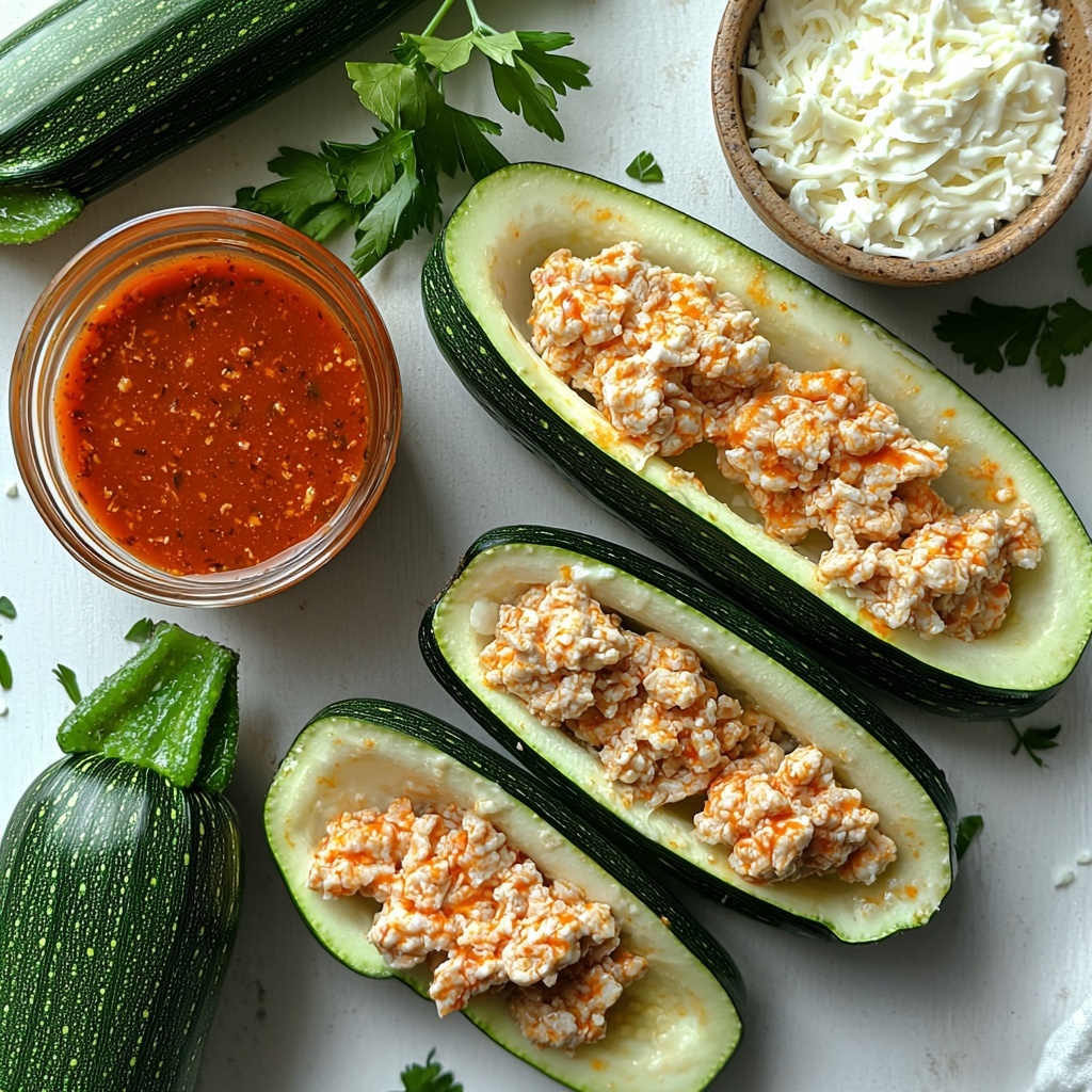 - Fill Zucchini: Spoon the buffalo chicken mixture into each hollowed zucchini half, filling them generously. Sprinkle shredded mozzarella cheese evenly over the tops of each stuffed zucchini boat.
