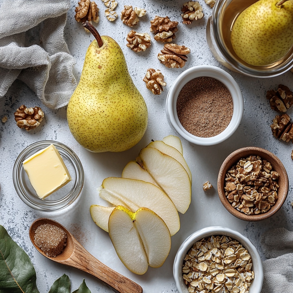 This recipe calls for a handful of simple ingredients that come together beautifully to highlight natural sweetness, cozy spices, and a touch of crunch. Each component plays an essential role—from the ripe yet firm pear that brings juicy sweetness, to the warmth of cinnamon and rich butter that create that irresistible caramel glaze.
