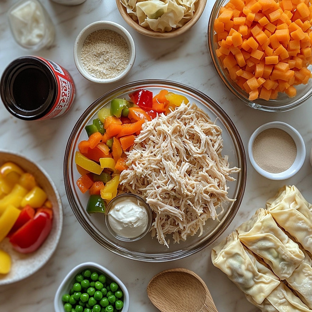 Getting the flavor just right means starting with a handful of simple, fresh ingredients that each play their role beautifully. From the tender shredded chicken to the crisp mixed vegetables, every component adds texture, color, and richness that make these wonton cups impossible to resist.