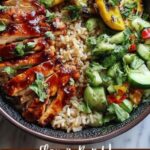 - Assemble the bowls: Spoon prepared brown rice into serving bowls, top with the sliced chicken, and spoon a generous amount of cucumber salad on top. Garnish with extra herbs, a drizzle of chili crisp, and lime wedges for added brightness.