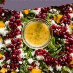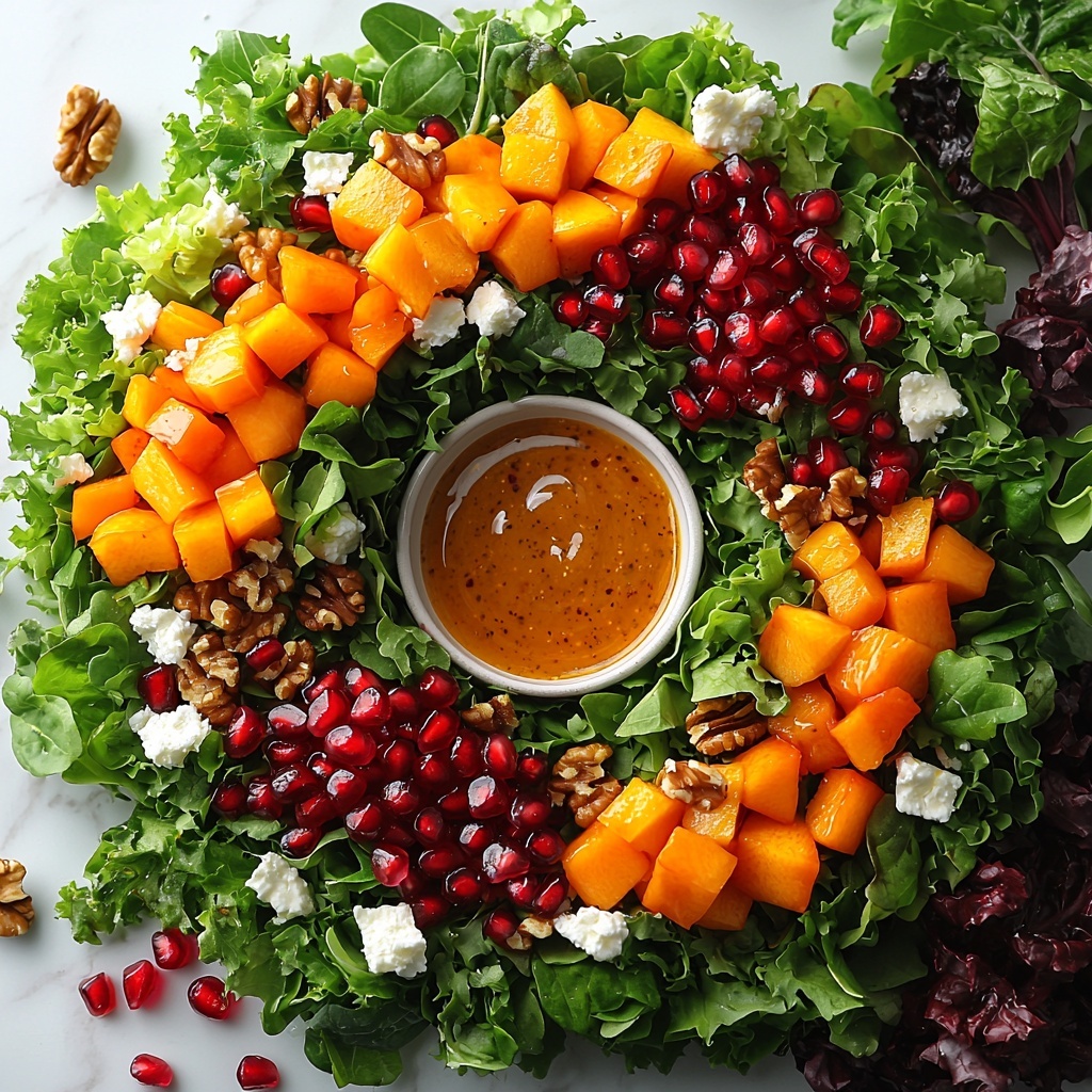 A festive and colorful Christmas Salad perfect for holiday gatherings, featuring spring mix greens, sweet persimmons, crunchy walnuts, vibrant pomegranate seeds, creamy feta cheese, and a tangy honey mustard dressing arranged beautifully like a holiday wreath.