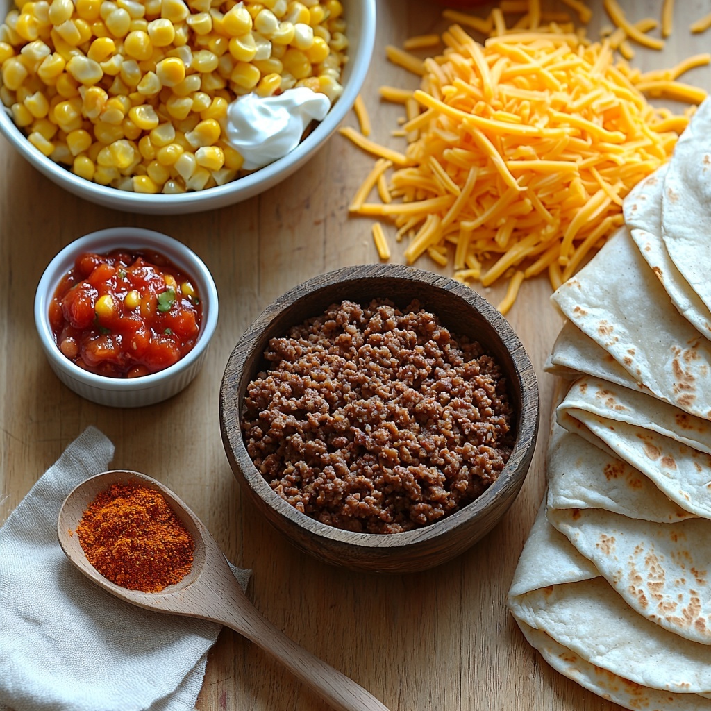 In a baking dish, start by laying down a flour tortilla. Next, spread a portion of the cooked beef, then a layer of refried beans, corn kernels, and a generous sprinkle of shredded cheese. Repeat these layers until you’ve used all your ingredients, finishing with a crown of cheesy goodness on top. Layering thoughtfully helps achieve that perfect balance of flavors and textures in every bite.