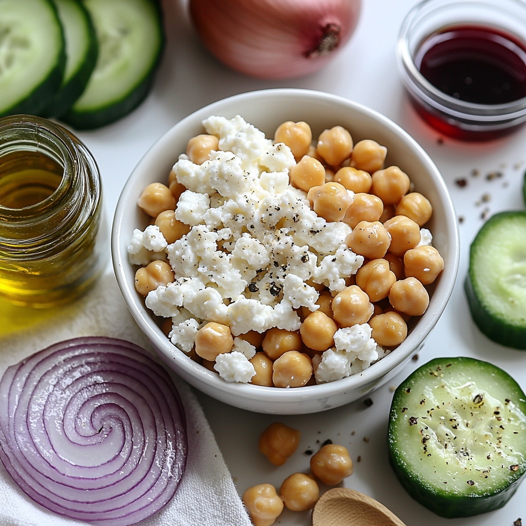- Combine Ingredients: In a large bowl, add the cottage cheese, drained chickpeas, diced cucumbers, and sliced red onion together.