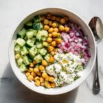 - Combine Ingredients: In a large bowl, add the cottage cheese, drained chickpeas, diced cucumbers, and sliced red onion together.
