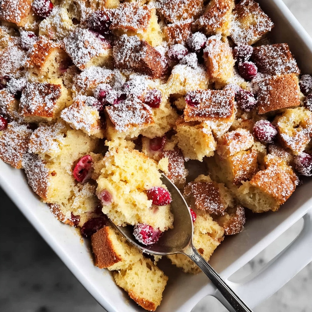 Allow your Cranberry Eggnog Doughnut Bread Pudding to cool and set for about 30 minutes before scooping. This resting time lets the pudding firm up just enough so it holds its shape but stays wonderfully tender inside. A light dusting of powdered sugar adds a finishing touch, making your dessert look as magical as it tastes.