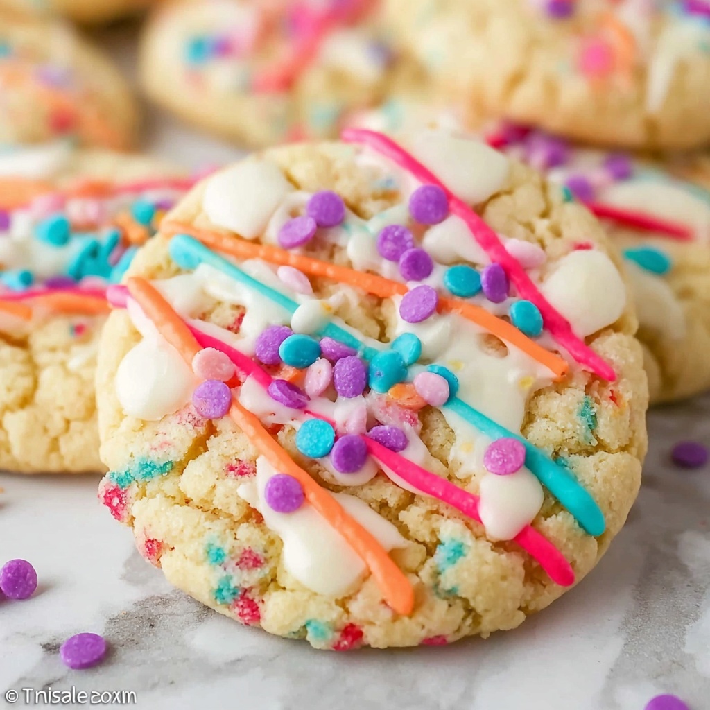 These colorful cookies are already festively decorated, but you can add an extra flourish with edible gold dust brushed lightly over the white chocolate or a few more sprinkles for a party-ready vibe. Garnishing with a small dollop of whipped cream or a dusting of powdered sugar can also elevate their presentation.
