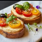 Enjoy a vibrant and delicious Mediterranean Hummus Crostini that’s perfect for summer snacking. This easy-to-make appetizer features crisp toasted sourdough slices generously layered with creamy hummus and topped with fresh cherry tomatoes, olives, cucumbers, pickled onions, crumbled feta, and a flavorful seasoning blend. Garnished with microgreens and edible flowers, these crostinis are as visually appealing as they are tasty.
