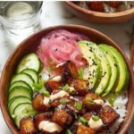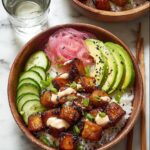 - Prepare the Bowl Components: Arrange the cooked rice as the base of each bowl. Top with thinly sliced cucumber, ripe avocado slices, and pickled red onions.