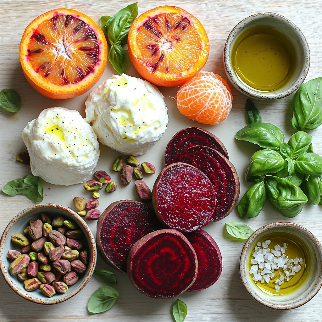 - Assemble the Salad: On individual serving plates or a large platter, arrange the orange segments and tear the burrata balls into bite-sized chunks. Artfully place the roasted beet wedges around the plate. Sprinkle chopped pistachios and ripped basil leaves over the top for crunch and fresh herbal flavor. Drizzle generously with the basil oil dressing and finish with a scattering of flaky sea salt to enhance all the flavors.