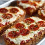 6. Add Toppings and Bake: Remove the baking sheet from the oven. Evenly spread pizza sauce over each slice, then top with shredded mozzarella cheese and pepperoni or your choice of toppings. Return the baking sheet to the oven and bake for an additional 10-13 minutes, or until the cheese is fully melted and the edges of the bread are golden brown and crisp. For extra browning on top, broil at 450° F for about 1 minute, keeping close watch to prevent burning.