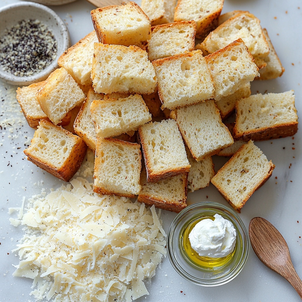Start by preheating your oven to 350°F so it’s ready to help those flavors meld perfectly. Then, cube your loaf of garlic bread into bite-sized pieces and spread them out evenly on a sheet pan. This sets the stage for an even bake that crisps the bread just right.