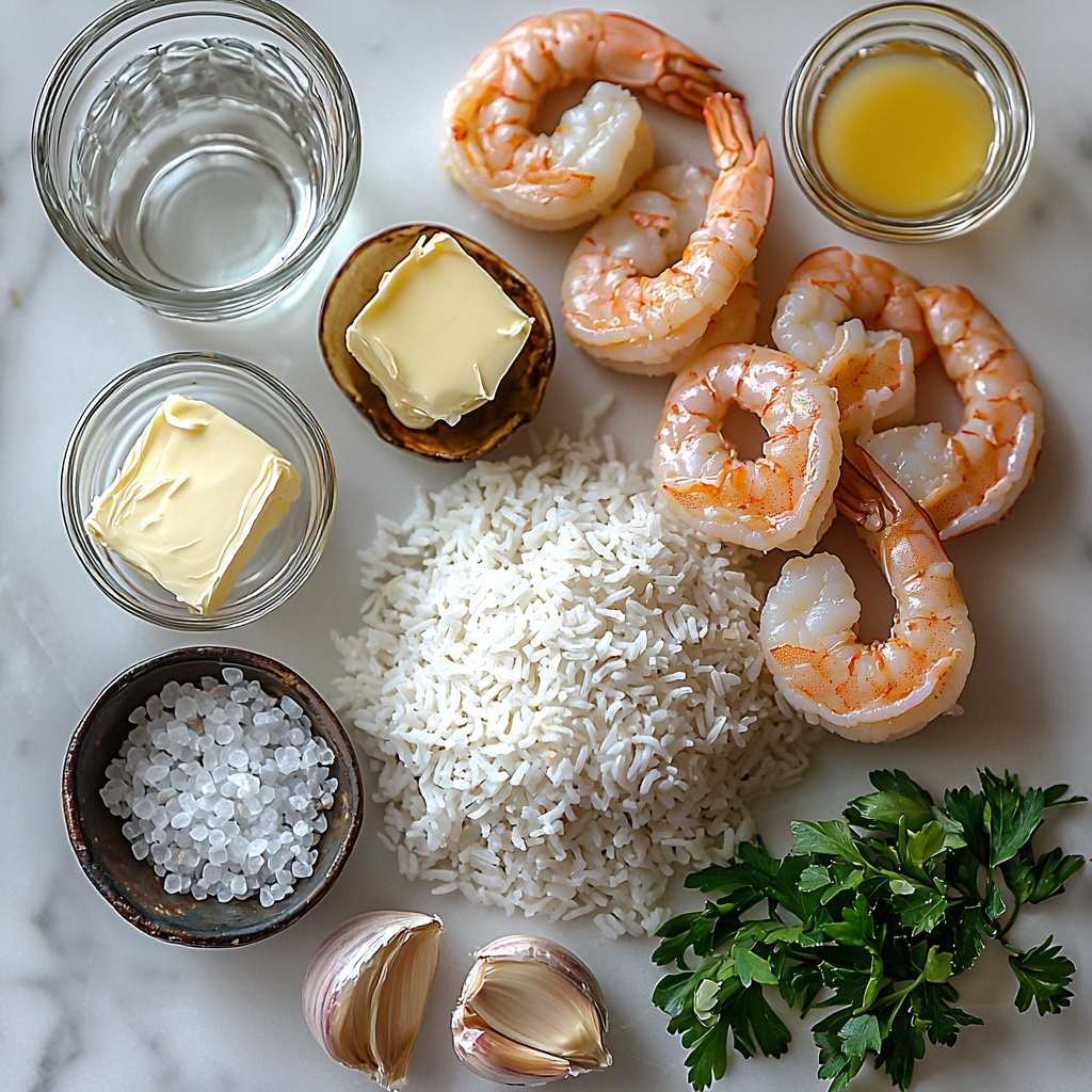 Getting started on the Garlic Butter Shrimp Rice Recipe means gathering a handful of ingredients that are easy to find yet incredibly impactful. Each component plays a vital role in the final dish: from the fluffy rice giving structure, to the garlic and butter layering rich aroma and flavor, to the shrimp adding a satisfying protein punch.