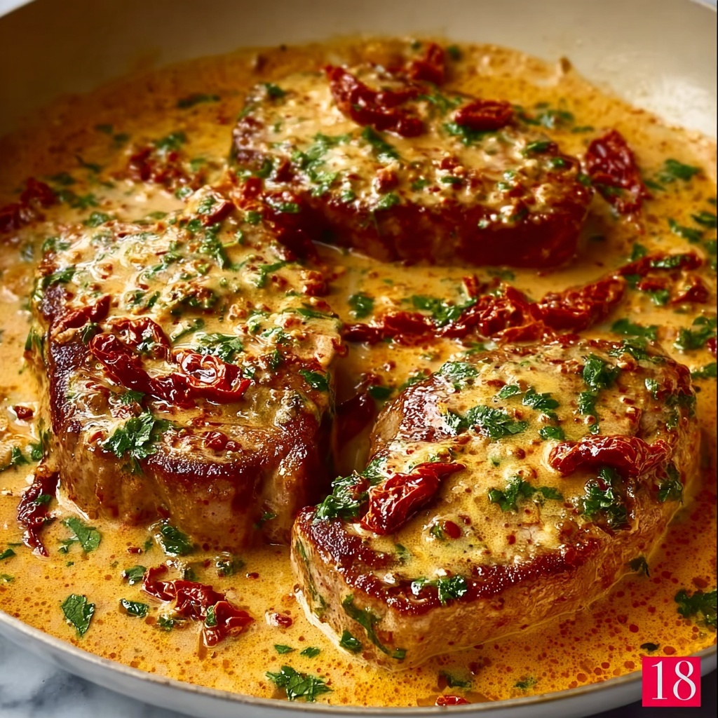 Tender boneless pork chops cooked to perfection in a rich, creamy garlic sauce with sun-dried tomatoes and Parmesan cheese, infused with Italian seasoning and a touch of red pepper flakes. This quick and flavorful skillet recipe delivers a comforting, restaurant-quality meal in just 20 minutes, perfect for weeknight dinners.