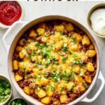 A hearty and flavorful Ground Beef and Potatoes skillet dish, featuring tender potatoes simmered with seasoned ground beef, aromatic vegetables, and a melty sharp cheddar topping. Perfect for a comforting weeknight meal, it’s enhanced with a blend of smoked paprika, oregano, and tangy tomato paste, finished with fresh green onions and optional sour cream and hot sauce for extra zest.