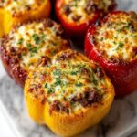 If you are searching for a comforting and satisfying meal that brings together vibrant colors and rich flavors, this Ground Beef Stuffed Peppers Recipe is an absolute winner. Juicy bell peppers are generously filled with a savory mixture of seasoned ground beef, garlic, tangy tomatoes, and fluffy rice, all topped with a golden layer of melted cheddar cheese. This dish is not only hearty but also visually stunning, perfect for family dinners or impressing guests. Once you try it, these stuffed peppers will quickly become one of your favorite go-to meals that delivers warmth and delight in every bite.