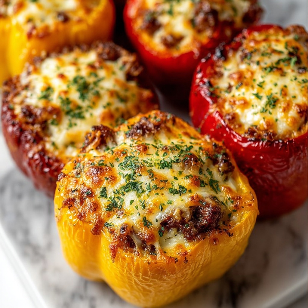 This Ground Beef Stuffed Peppers recipe features large bell peppers filled with a savory mixture of lean ground beef, sautéed onions, garlic, crushed tomatoes, cooked rice, and a blend of cheddar cheese. The peppers are baked to tender perfection, topped with melted cheese for a satisfying and comforting meal that’s perfect for dinner or meal prep.