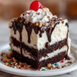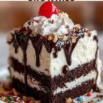Presentation is everything when you serve this dessert. Dollops of freshly whipped cream add a cloud-like softness on top, while colorful sprinkles bring joyous pops of color. Sprinkle chopped nuts for a delightful crunch, and crown each slice with a glossy maraschino cherry. Don’t forget to drizzle generous amounts of hot fudge sauce just before serving for a glossy, irresistible finish.