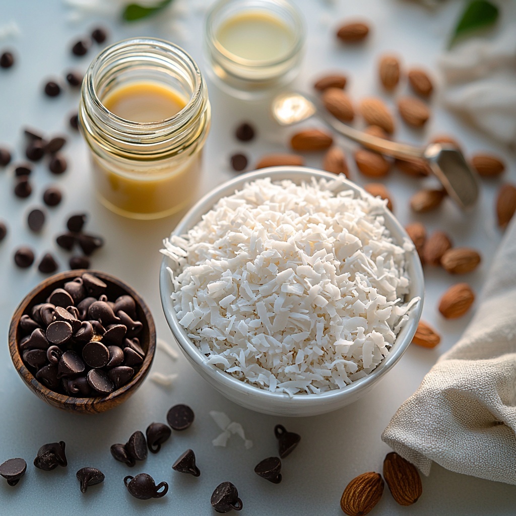 This Homemade Almond Joys Recipe calls for simple ingredients that come together to create an irresistible harmony of flavors and textures. Each component plays a key role, from the chewy coconut base to the luscious chocolate coating, making every bite a little slice of heaven.