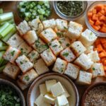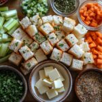 Sourdough sandwich bread slices and rustic potato bread slices, cut into small golden toasted cubes arranged neatly in a small bowl; a half cup of smooth, creamy butter in a vintage ceramic dish; diced translucent white onions, bright green celery pieces, and vibrant orange carrot cubes separated in small piles on a clean white wooden surface; a small heap of finely minced garlic next to a bunch of chopped fresh Italian parsley with rich green leaves; small bowls with dried sage, poultry seasoning, dried thyme, and dried marjoram—each showing textures of fine herbs in soft earthy tones; a teaspoon of coarse sea salt crystals alongside a small dish of freshly cracked black peppercorns; clear glass measuring cup filled with low-sodium chicken broth, showcasing its warm golden color; natural daylight illumination highlighting the varied textures—from crisp toasted bread cubes to glossy butter and fresh herbs—with soft shadows adding depth; all ingredients thoughtfully spaced and balanced, framed for clarity and visual appeal with minimalistic rustic styling on a bright clean surface, accentuating the fresh and wholesome vibe, overhead shot, top down view, flat lay photography, professional food styling --ar 1:1 --q 2 --s 750 --v 6.1