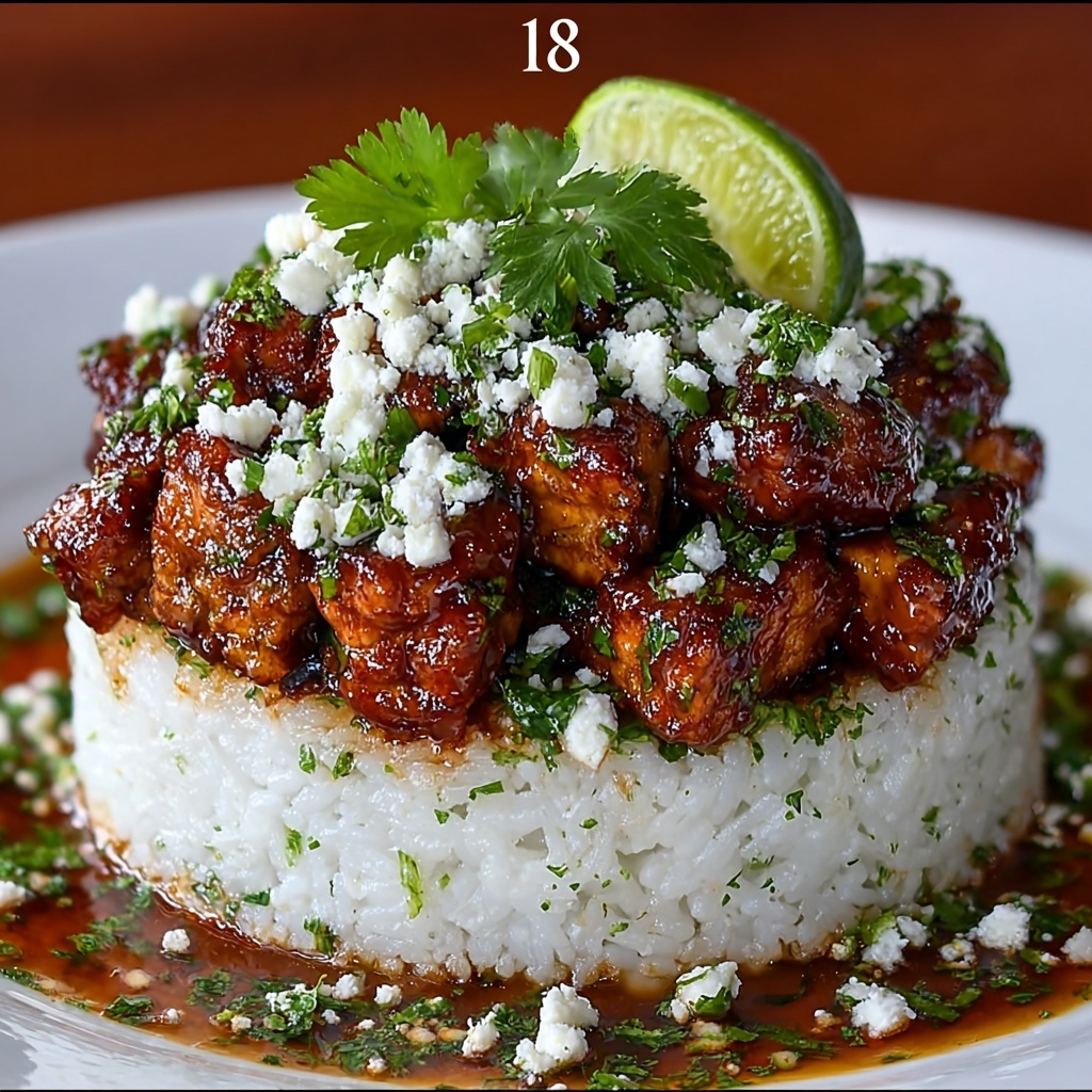 - Top with glazed chicken and garnishes: Spoon the honey lime chicken on top of the rice, then sprinkle with crumbled feta cheese and chopped fresh parsley and cilantro for an herby finish.