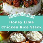 A vibrant and delicious Honey Lime Chicken Rice Stack featuring tender, honey-lime glazed chicken breast atop fluffy white rice, topped with tangy feta cheese and fresh herbs. Ready in just 25 minutes, this easy skillet meal offers a perfect balance of sweet, tangy, and savory flavors ideal for a quick weeknight dinner.
