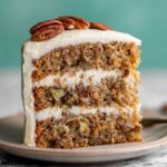 - Assemble Cake: Place one cake layer on a cake stand or serving plate. Spread a generous, even layer of frosting on top. Repeat with the second and third cake layers. Cover the entire cake with the remaining frosting, smoothing the top and sides. Decorate with the reserved toasted pecans pressed gently along the top and sides.