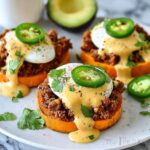 Now comes the fun part. On each serving plate, stack two grilled butternut squash slices, spread a generous layer of mashed avocado, spoon on the seasoned chorizo, and top with a perfectly poached egg. Drizzle with the smoky chipotle hollandaise, and finish with fresh jalapeño slices and chopped cilantro as vibrant, flavorful garnishes that make the dish pop.