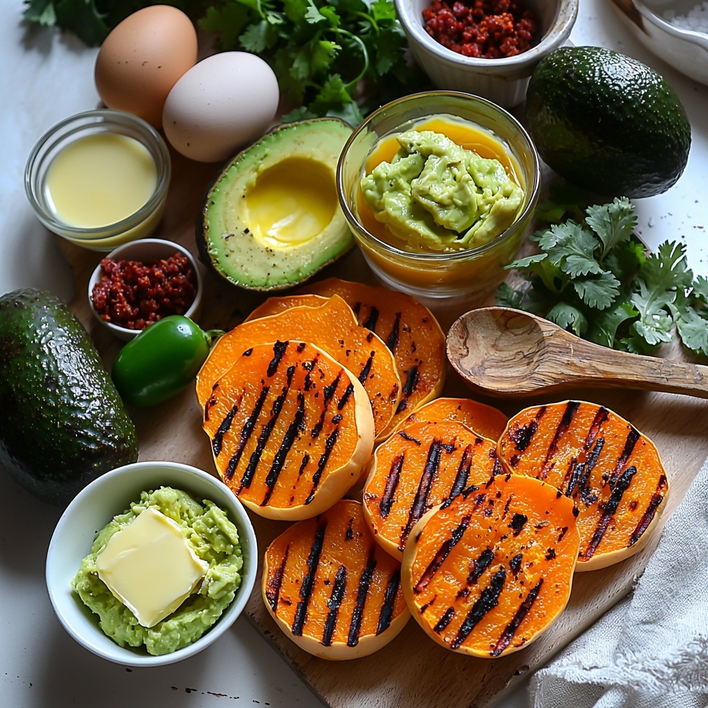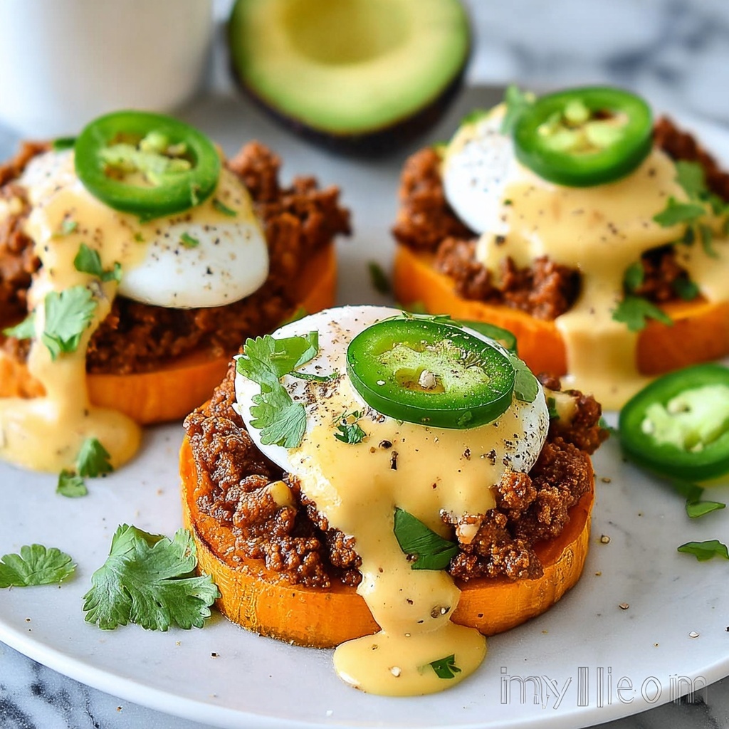 5. Assemble the Mexican Eggs Benedict: On each plate, place two grilled butternut squash slices as the base. Spread or mash the avocado over the squash, then spoon generous portions of the cooked chorizo on top. Place a poached egg over the chorizo, drizzle with the chipotle hollandaise sauce, and garnish with sliced jalapeños and chopped cilantro for an added kick and freshness.