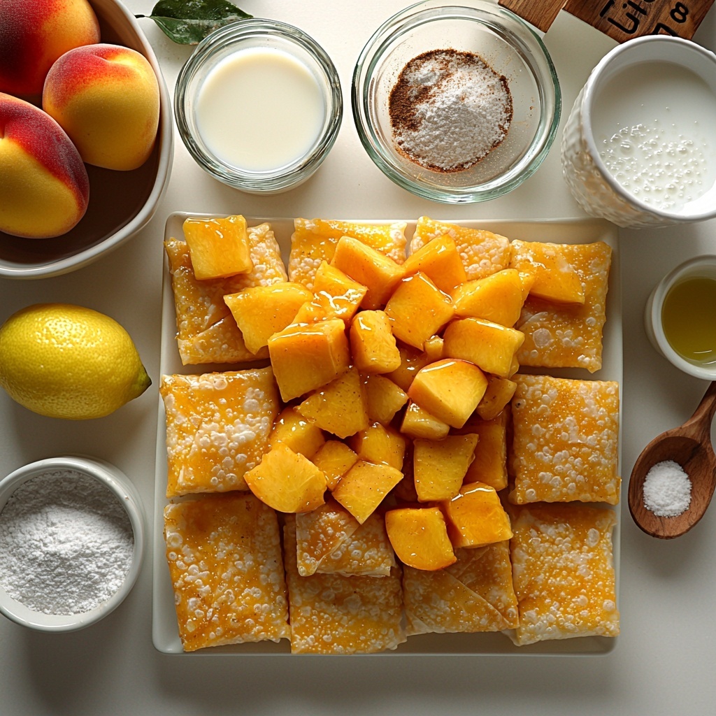 - Prepare the peach filling: Combine diced peaches with 1/4 cup granulated sugar, cornstarch, 1 teaspoon cinnamon, and lemon juice in a bowl. Toss to coat evenly and set aside to allow the mixture to thicken slightly.