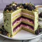 - Garnish: Decorate the top of the assembled cake with fresh blackberries and sprinkle with chopped pistachios for an attractive finish and added texture.