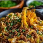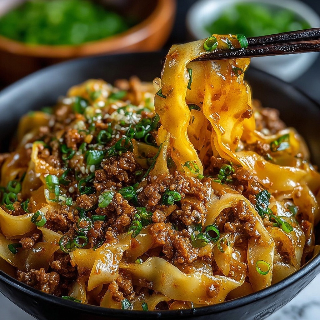 This Potsticker Noodle Bowl is a quick and flavorful Asian-inspired dish featuring tender ground pork, wide Lo Mein noodles, and a vibrant mix of coleslaw and green onions tossed in a savory sauce made from chicken broth, mirin, dark soy sauce, garlic, ginger, sesame oil, and a hint of sriracha for spice. Ready in just 25 minutes, it’s a perfect weeknight meal packed with texture and umami.