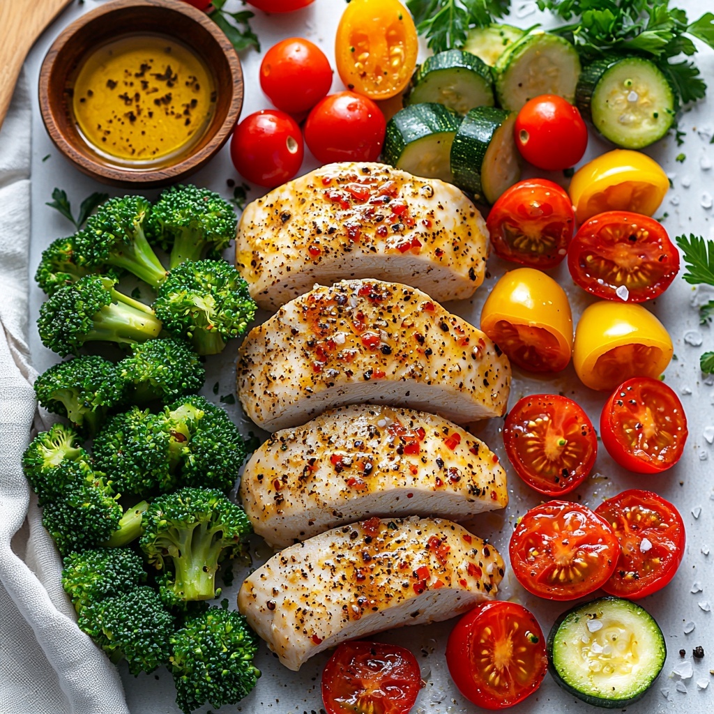 - Arrange Ingredients on Sheet Pan: Place the chicken breasts in the center of the prepared sheet pan. Arrange the broccoli florets, sliced bell peppers, cherry tomatoes, and sliced zucchini evenly around the chicken to ensure even cooking.