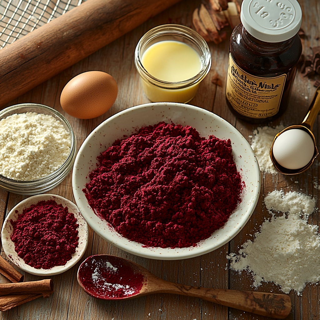 This recipe relies on simple, pantry-friendly ingredients that combine to create the magic of red velvet. Each one plays a key role, from giving the cookies their signature color and flavor to ensuring the perfect texture and delightful crinkle finish.