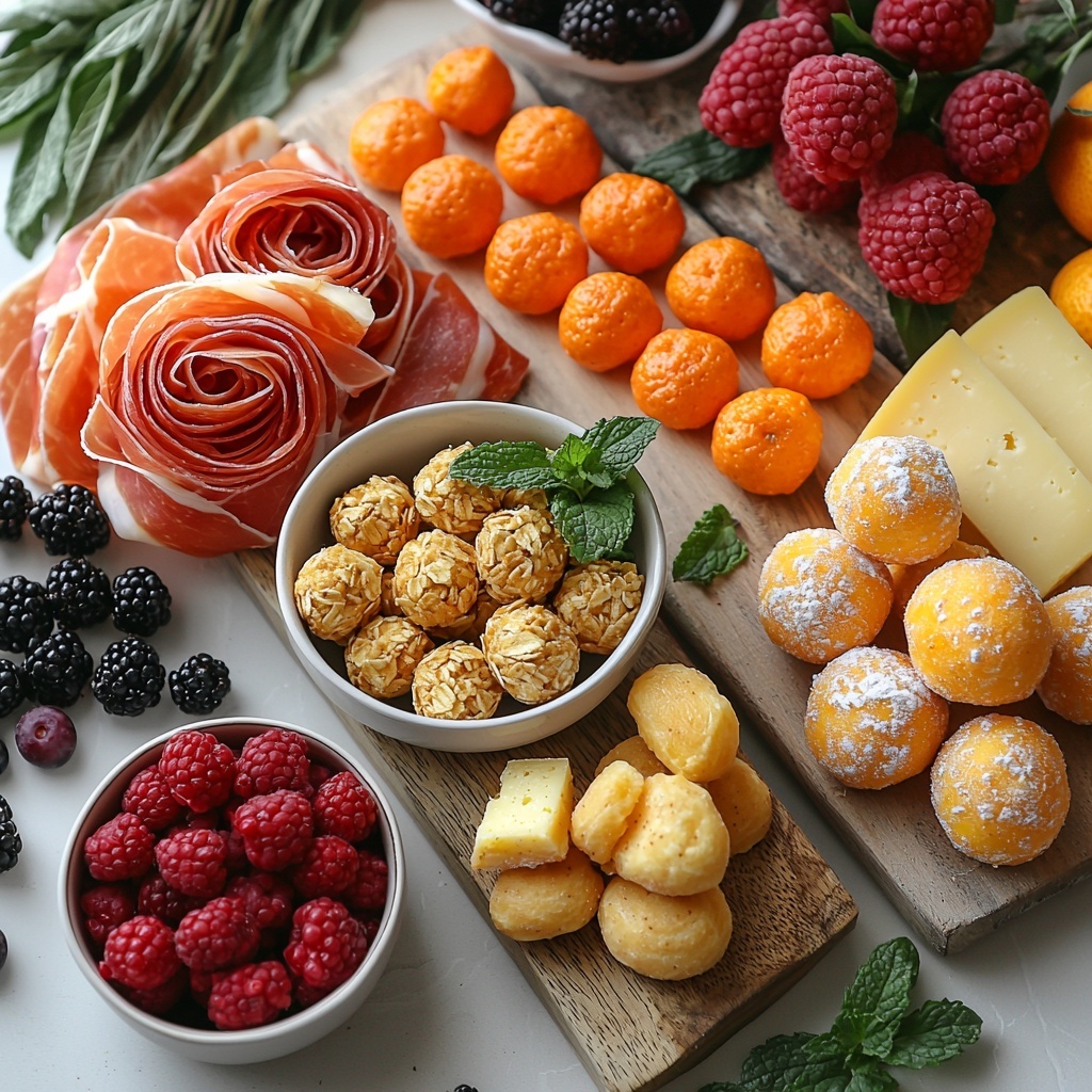 Fresh herbs like mint or basil make perfect garnishes, adding both a burst of color and a refreshing aroma that complements the other ingredients. A light drizzle of honey over the fruit or a sprinkle of flaky sea salt on the prosciutto can elevate the flavors beautifully.