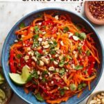 A vibrant and refreshing Sesame Ginger Carrot Salad featuring shredded carrots, red bell pepper, and fresh herbs tossed in a tangy sesame-ginger dressing. This easy no-cook salad is perfect as a light side dish or a healthy snack with a delightful crunch from peanuts or cashews and a hint of spice from crushed red pepper flakes.