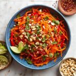 2. Prepare the Salad: In a medium bowl, combine the shredded carrots, chopped red bell pepper, chopped fresh cilantro, sliced scallions, and chopped peanuts or cashews. Drizzle the prepared dressing over the salad ingredients.