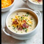 Now for the best part — ladling the soup into bowls and generously topping with crispy bacon, extra cheddar cheese, fresh chopped chives, and a dollop of tangy sour cream. These garnishes not only add eye-catching color but also layers of flavor and texture that make this soup truly unforgettable.