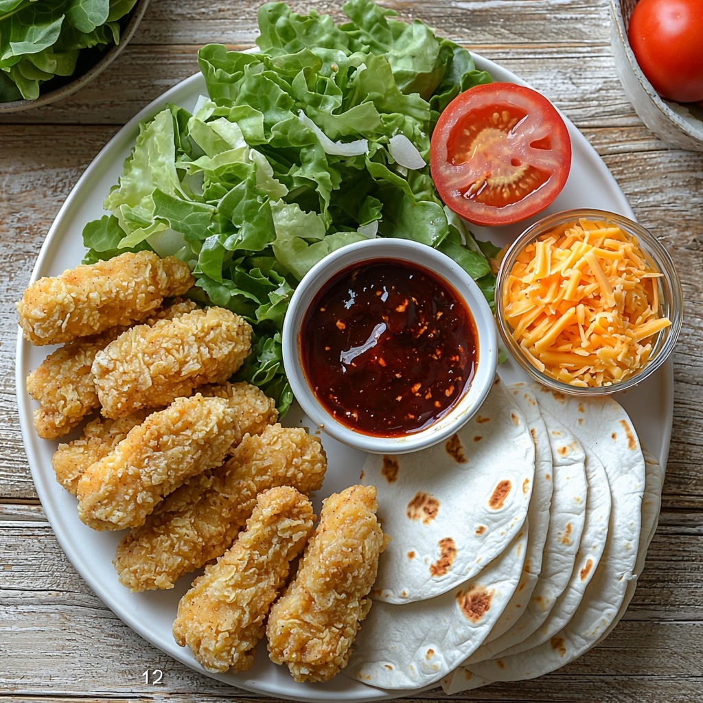 - Assemble Wraps: Lay out the flour tortillas. Place two sauce-coated chicken fingers onto each tortilla. Add shredded cheddar cheese, chopped lettuce, and sliced tomato as desired.