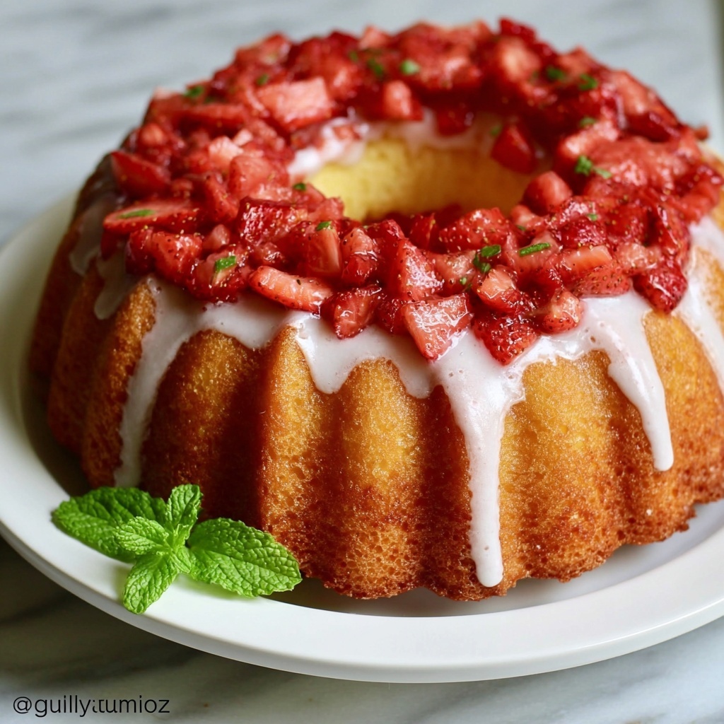 Drizzle the glaze evenly over the top of your pound cake, letting it naturally drip down the sides for a picture-perfect look. Sprinkle finely chopped strawberries over the top and across the platter for that extra pop of color and freshness. Serve immediately, or let the glaze set for a few minutes before slicing and enjoying.