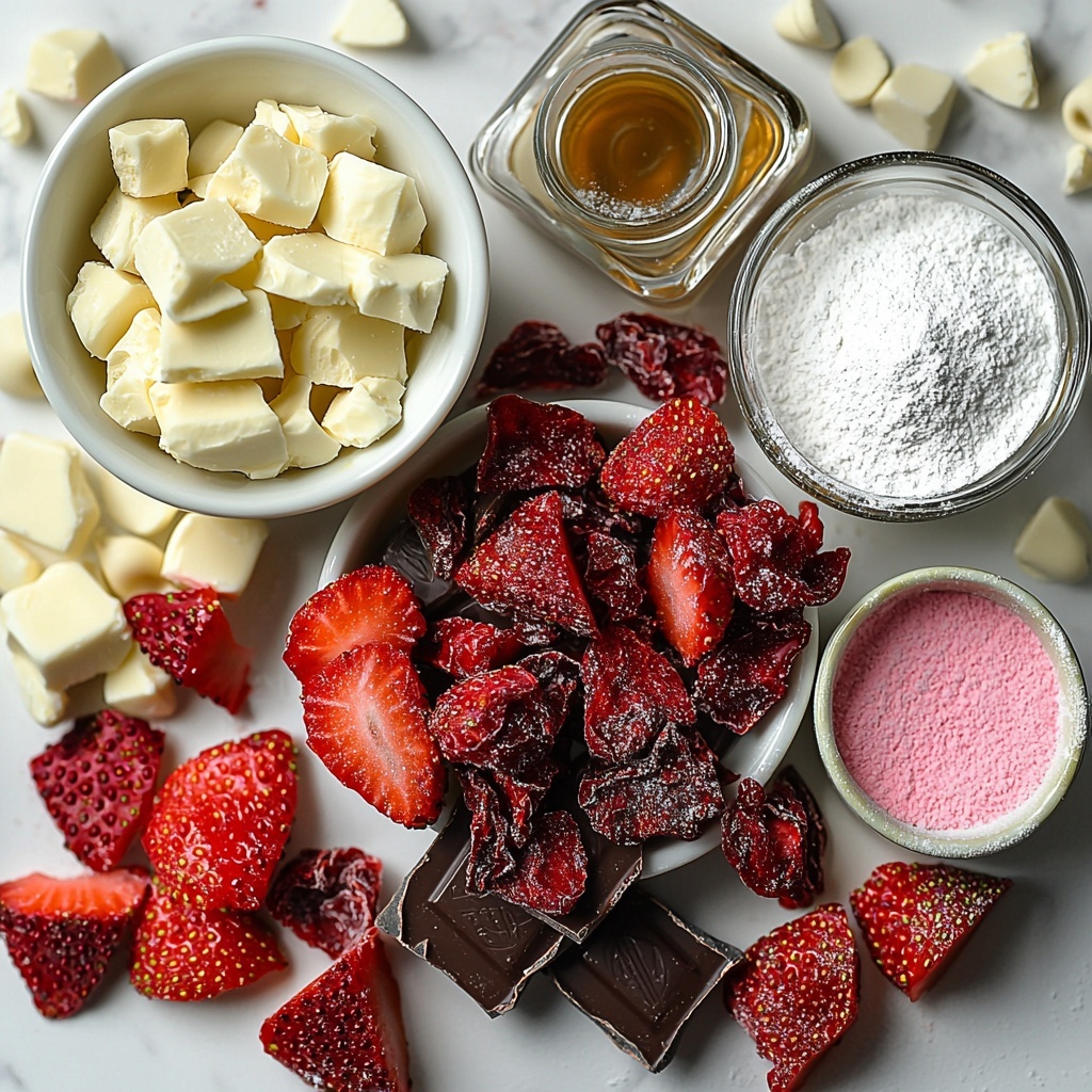 Gathering the right ingredients is the first step toward creating these irresistible truffles. This list is wonderfully straightforward, showcasing fresh strawberries for a natural burst of flavor, quality white chocolate for silkiness, and a few other simple essentials that come together to create that perfect creamy texture and rich taste.
